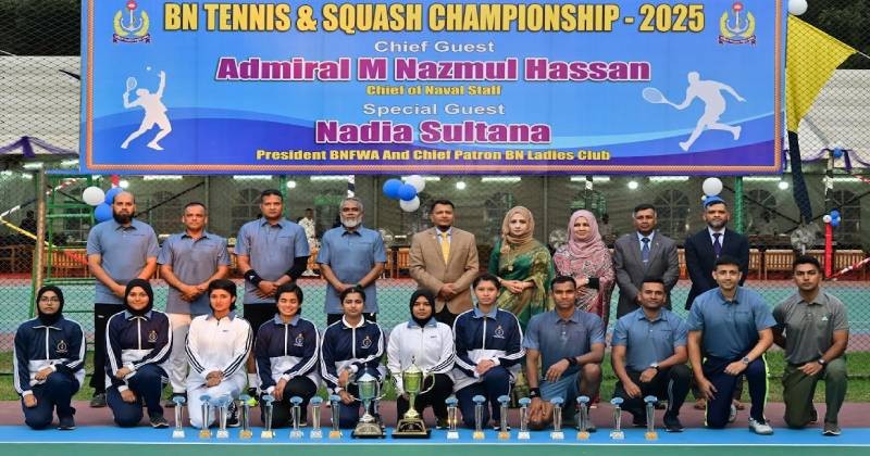 বাংলাদেশ নৌবাহিনীর বাৎসরিক ‘টেনিস ও স্কোয়াশ প্রতিযোগিতা-২০২৫’ এর সমাপনী অনুষ্ঠান আজ বুধবার চট্টগ্রামের ‘এরিয়া টেনিস এন্ড স্কোয়াশ কমপ্লেক্স’-এ অনুষ্ঠিত হয়েছে। প্রতিযোগিতার সমাপনী দিনে নৌবাহিনী প্রধান এডমিরাল এম নাজমুল হাসান প্রধান অতিথি এবং বাংলাদেশ নৌবাহিনী পরিবার কল্যাণ সংঘের প্রেসিডেন্ট নাদিয়া সুলতানা বিশেষ অতিথি হিসেবে উপস্থিত থেকে খেলা উপভোগ করেন এবং বিজয়ীদের হাতে পুরস্কার তুলে দেন।
