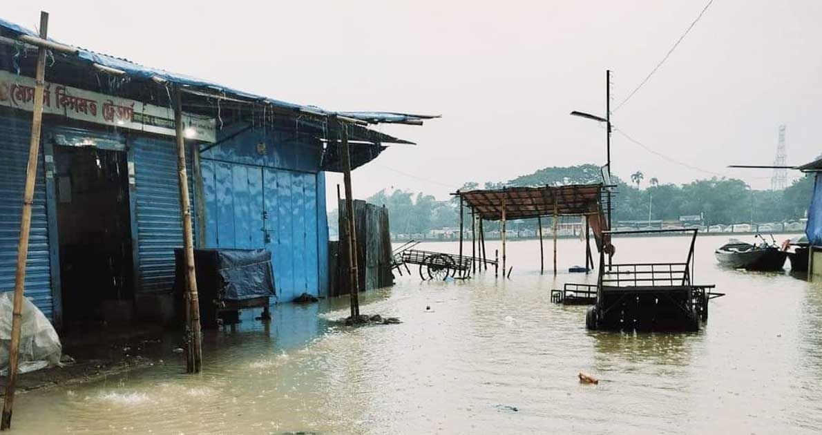 শহরের কাঁচাবাজারে হাঁটুর উপরে পানি। পশ্চিম বাজার, মধ্যবাজারে বন্যার পানি উঠছে। বিভিন্ন পয়েন্ট দিয়ে শহরে ঢুকছে পানি।